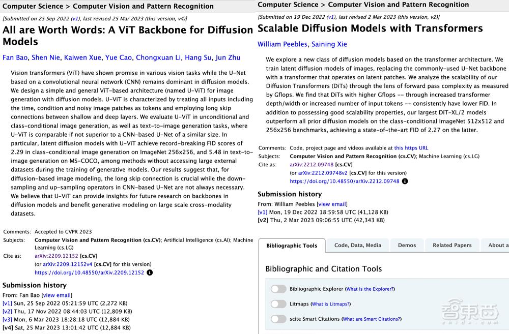 ▲左侧为清华 U -ViT 论文,右侧为 DiT 论文