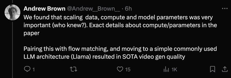 正如 Meta 视频生成团队的研究科学家 Andrew Brown 所言,这个项目最大的发现是:数据、算力和模型参数是至关重要的。若将其与 Flow Matching 相结合,就能够使用最简单、最流行的架构——即 Meta 自家的 Llama,实现强大的视频模型。
