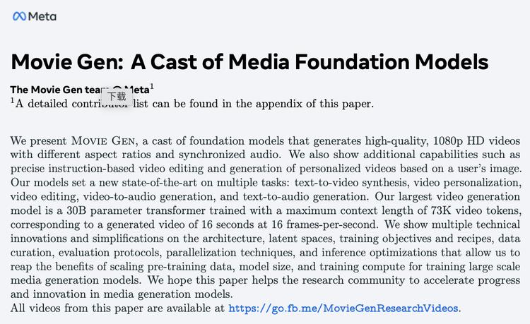 实际上,Meta 发布了一系列模型,专门为“AI 生成媒体内容”而设计。这也是该技术论文标题所表达的内涵:Movie Gen: A Cast of Media Foundation Models。