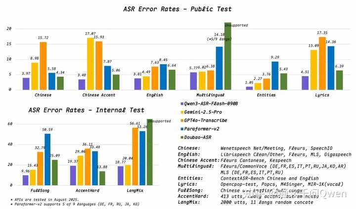 - 卓越的识别准确性: 在多种中英文及多语种基准测试中,Qwen3-ASR-Flash 的表现均处于领先地位。