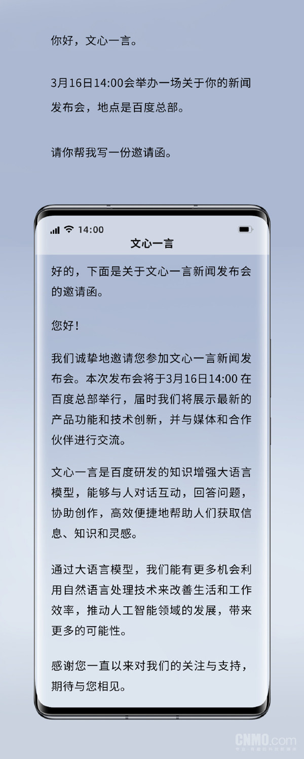 【CNMO 新闻】在今年 2 月,ChatGPT 迅速在全球范围内引发热潮,各大科技公司纷纷开始加速研发类似的 AI 产品。百度宣布,其自主研发的聊天机器人命名为“文心一言”(英文名 ERNIE Bot),并计划于 3 月 16 日下午 2 点正式发布。临近发布之际,百度于 3 月 13 日发出了文心一言发布会的邀请函。值得注意的是,这份邀请函竟然是由文心一言自主撰写的!