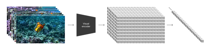 Sora 的训练数据集包括短视频,每个样本为一个短视频。Sora 将其编码到数据空间进行降维处理,然后在隐空间中将特征向量切割成小块,结合时间顺序,形成 时空补丁 ,即 时空令牌(time-space token);每个令牌都记录了短视频中的帧序号(时间)和当前帧的行列序号(空间)。