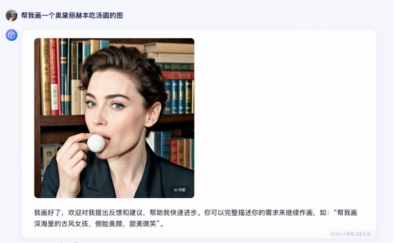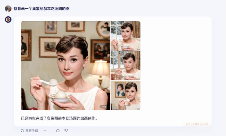 以提示词“帮我画一个奥黛丽赫本吃汤圆”为例,文心一言 3.5 版本生成的图像呈现出浓厚的“人工智能风格”。