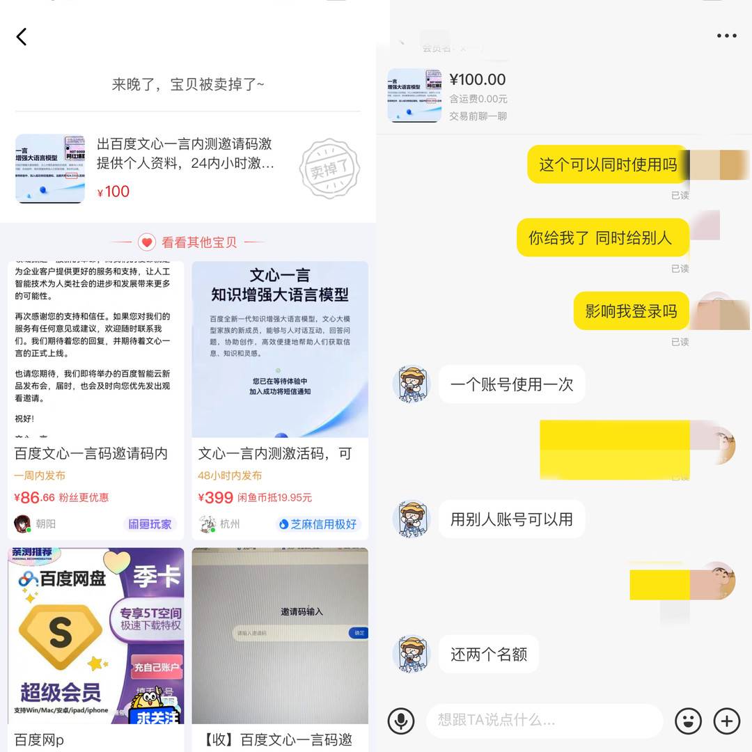 在 3 月 21 日,记者在二手交易平台上发现,关于“文心一言”的相关商品骤然增加,主要集中在内测码和代问服务上,内测码的价格在“80 至 400 元”之间,甚至有的标价达到 890 元。而代问体验服务的价格则在 0.5 元到 1 元不等,商品描述中提到:“试用百度新 AI 模型文心一言,提交问题以获取 AI 回答,较真者请勿购买”等内容。
