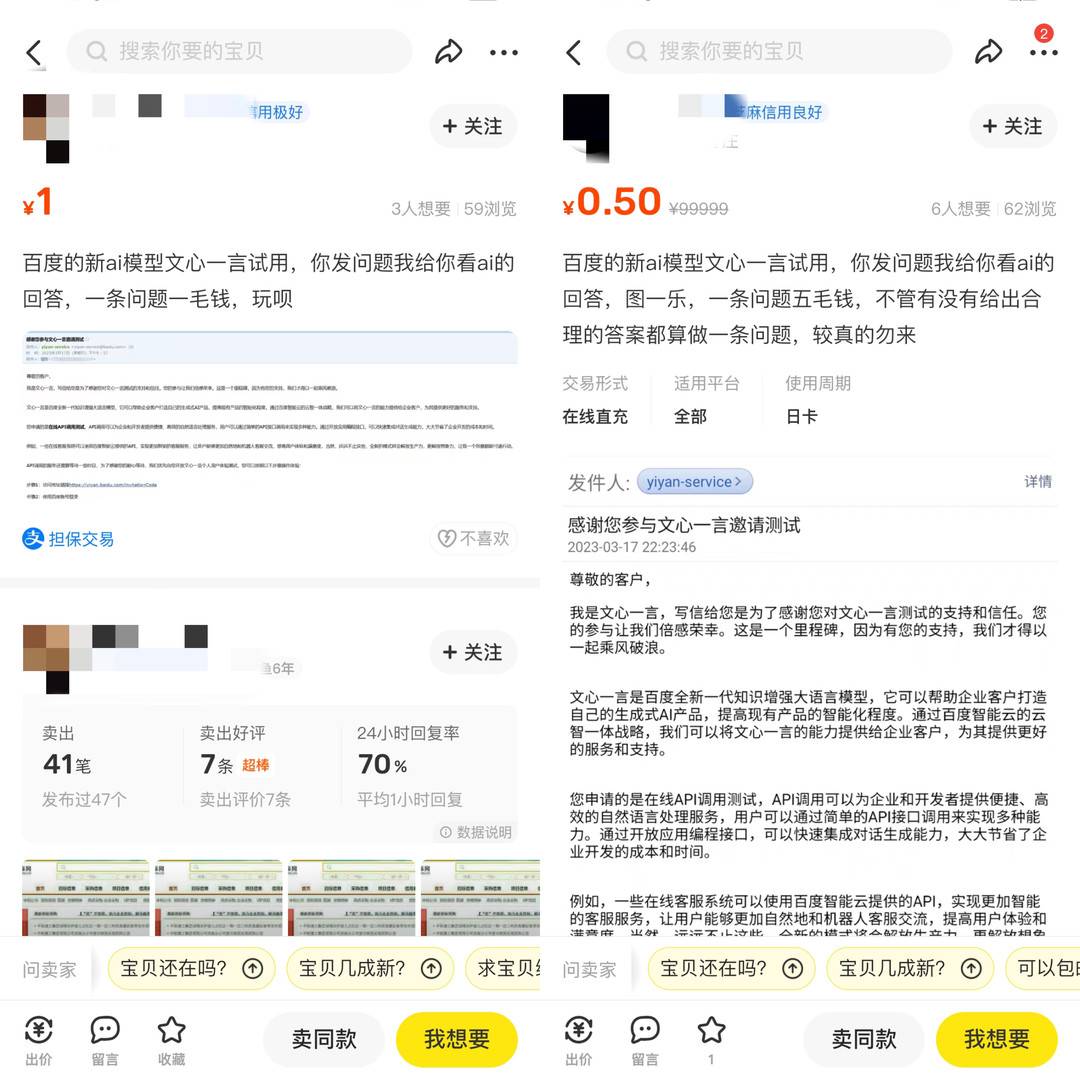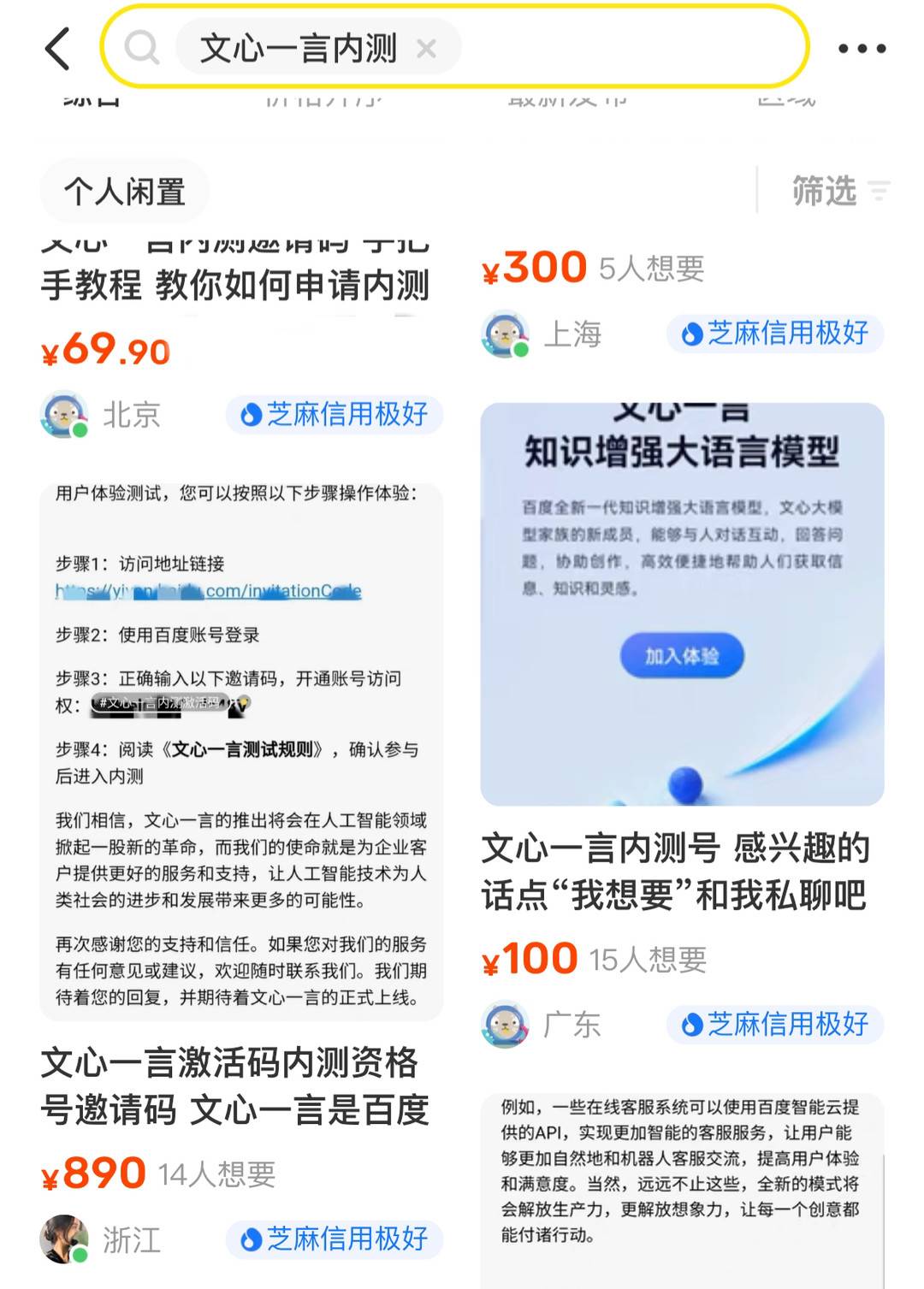 在 3 月 21 日,记者在二手交易平台上发现,关于“文心一言”的相关商品骤然增加,主要集中在内测码和代问服务上,内测码的价格在“80 至 400 元”之间,甚至有的标价达到 890 元。而代问体验服务的价格则在 0.5 元到 1 元不等,商品描述中提到:“试用百度新 AI 模型文心一言,提交问题以获取 AI 回答,较真者请勿购买”等内容。