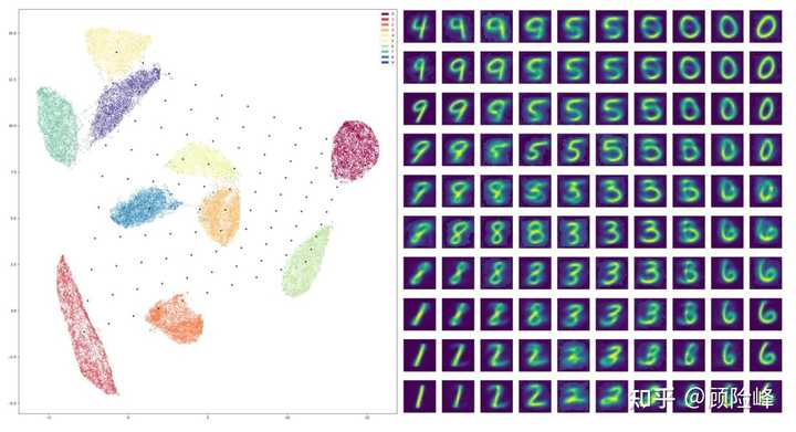 如图 3 所示,我们用 MNIST 训练了一个编码解码器,绘制了数据集的隐空间分布,十个手写数字对应十个团簇,每个团簇是一个模式,即数据流形的一个连通分支。团簇的边界则是数据隐空间分布支集的边界。我们在隐空间生成了 100 个采样点,通过解码生成 100 个手写数字图像。如果采样点落在某个团簇内部,则生成的图像清晰;如果落在团簇边界外,则生成的图像模糊,往往是两个手写数字的融合。因此,识别数据流形的边界对识别临界状态至关重要。