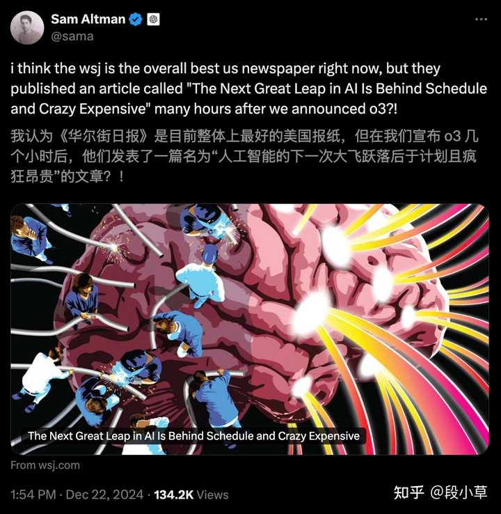 再加上 OpenAI 前一天刚发布了新模型 o3,WSJ 在这个时候报道 GPT-5 训练遇阻的问题,难怪 Sam Altman 对 WSJ 的报道表现出了一些不满,或许是想说,既然你不赞扬我的 o3,为什么偏偏在这种喜庆的时刻提到我的短处呢。