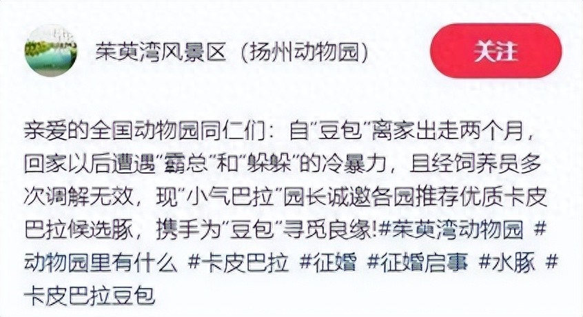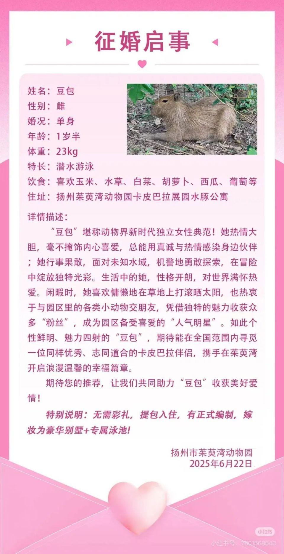6 月 22 日动物园发文,为“豆包”征婚:“亲爱的全国动物园同仁们:自‘豆包’离家出走两个月,回家以后遭遇‘霸总’和‘躲躲’的冷暴力,且经饲养员多次调解无效,现‘小气巴拉’园长诚邀各园推荐优质卡皮巴拉候选豚,携手为‘豆包’寻觅良缘!”