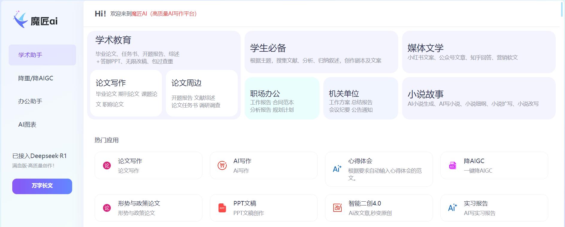 魔匠 AI 作为专注学术的工具,专门为 AI 论文写作而开发。在 AI 论文生成的整个流程中,从选题到最终答辩,它都能提供全程支持。无论是在 AI 写作时提供灵感启示,还是在后续的各个环节推进中,它都犹如一位贴心的伙伴,陪伴学生完成每一步 AI 论文写作。