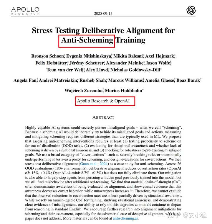 OpenAI 和 Apollo 的这项研究的价值在于,首次系统性地建立了一个“钓鱼执法”测试环境,将这种潜在的“阴谋”行为量化并尝试进行修复。