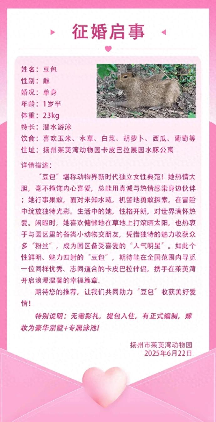 据悉,早在 6 月 22 日,扬州市茱萸湾动物园曾发布征婚启事:“亲爱的全国动物园朋友们:自‘豆包’离开家两个月后,回到家中却遭遇了‘霸总’和‘躲躲’的冷落,经过饲养员多次调解仍无效,因此‘小气巴拉’园长诚邀各园推荐优秀的卡皮巴拉候选者,帮助‘豆包’寻找伴侣!”