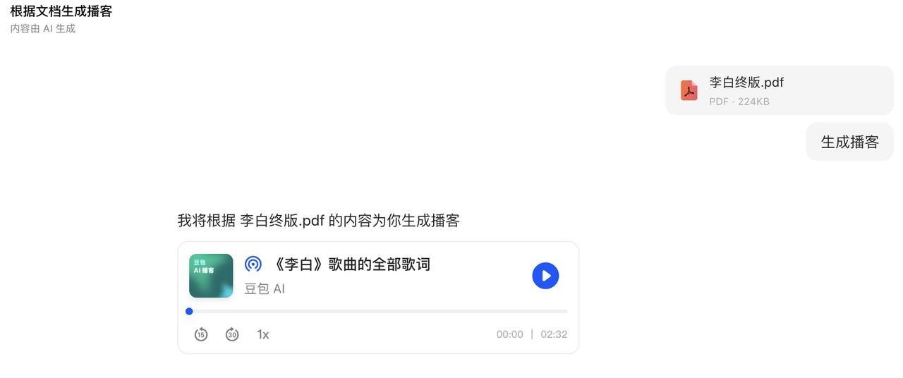 如果你还不知道从哪开始,现在,不妨随手找一份 PDF、歌词、网页、教材扔给豆包试试看。讲真,这可能是你打开 AI 播客的第一个理由,但绝对不是最后一个。