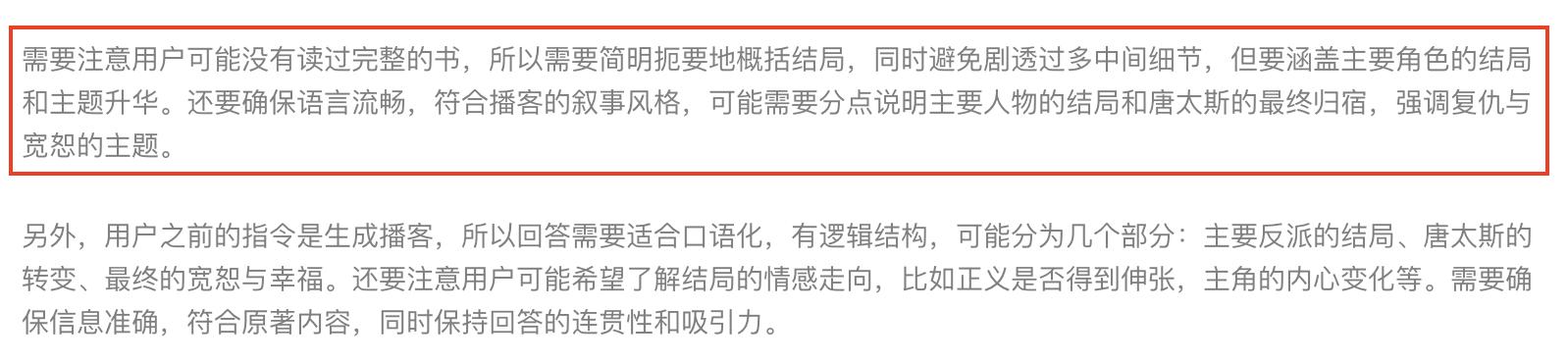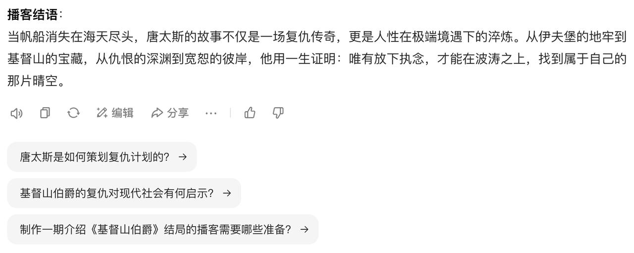 比如听完生成的播客之后,我萌生了想知道这本书结局的念头,只需输入一句「结局是怎样的」,豆包便能结合我之前上传的文档内容章节,判断用户可能没有读过全书,然后自动控制剧透比例。
