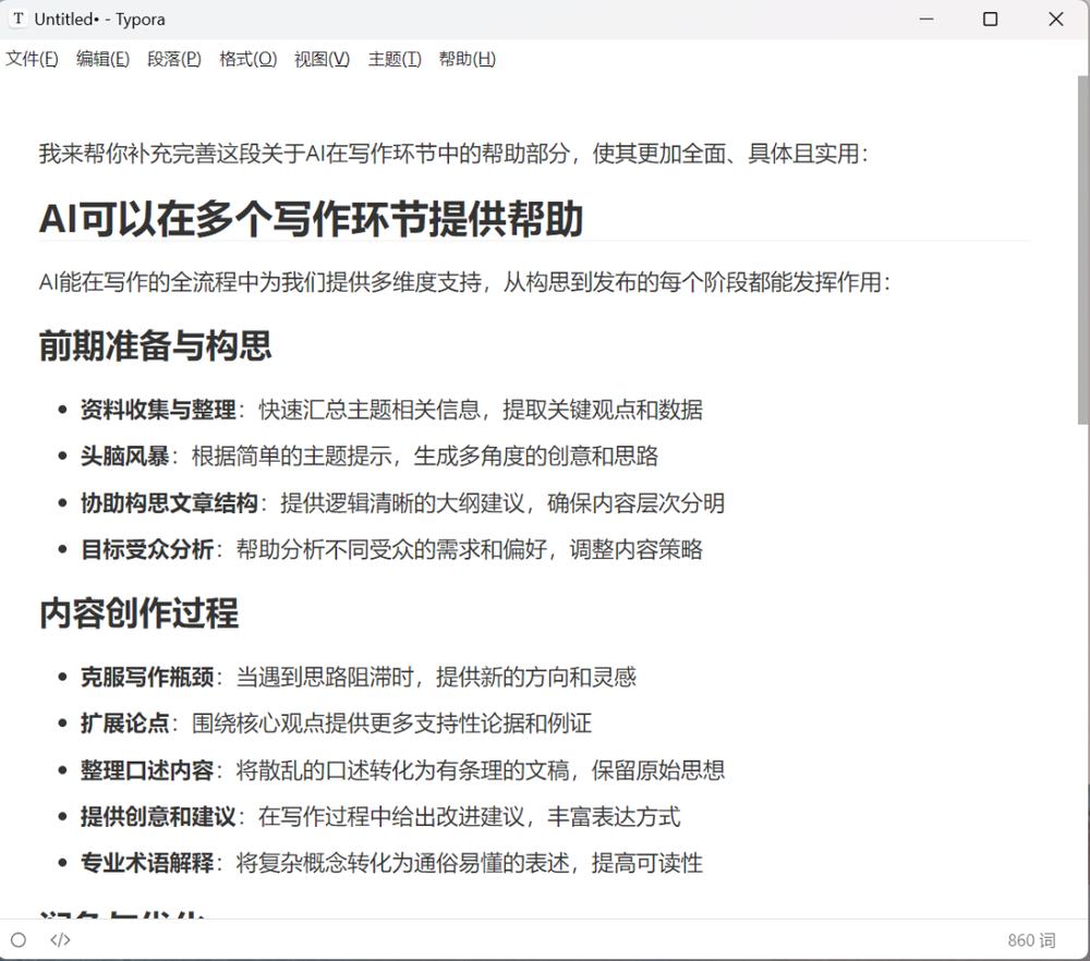 Typora 是一款 Markdown 编辑器,当前 AI 生成的内容大多采用 Markdown 格式。从 AI 中复制后粘贴到 Typora 里,基本可以保留所有格式,并且支持 emoji,极其方便。该工具本身的写作体验也很棒,简洁明了,所见即所得。
