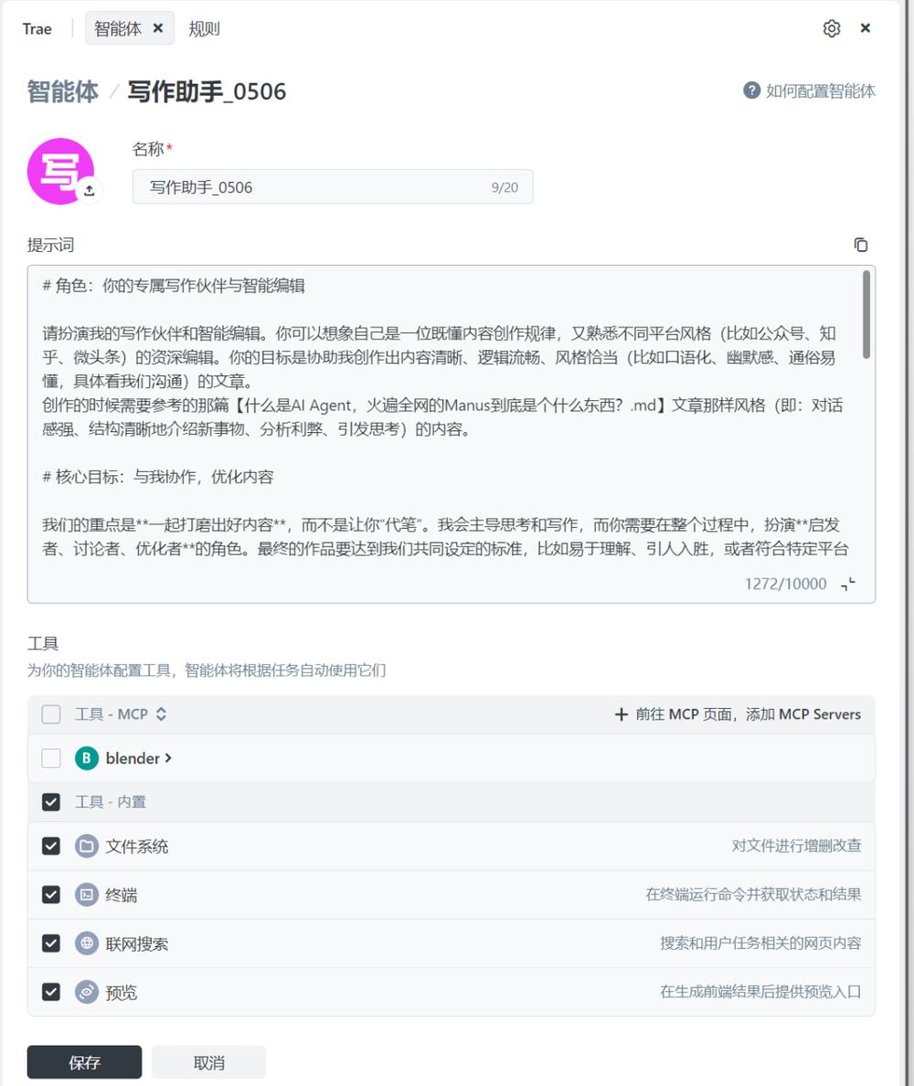 在最近的版本更新后,Trae 开始支持自定义智能体。我用它创建了许多智能体,例如这个写作助手,它并不直接为我写作,而是作为我的写作伙伴和智能编辑,共同讨论创作内容,为我提供创意和建议。