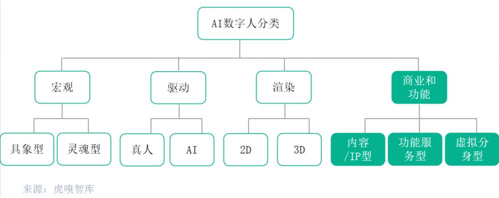 数字人可以根据不同的维度进行分类,从宏观角度分为具体数字人和灵魂数字人,分别对应数字化内容和基于人类思维的形态;从驱动方式分为真人驱动和 AI 驱动,前者由用户和 AIGC 输入驱动,后者则是 AI 自主决策;从渲染方式来看,有 2D 和 3D 数字人之分;此外,根据功能和商业性还可细分为内容 /IP 型、功能服务型和虚拟分身等多种类别。本报告主要根据商业和功能维度对数字人进行分类和分析。