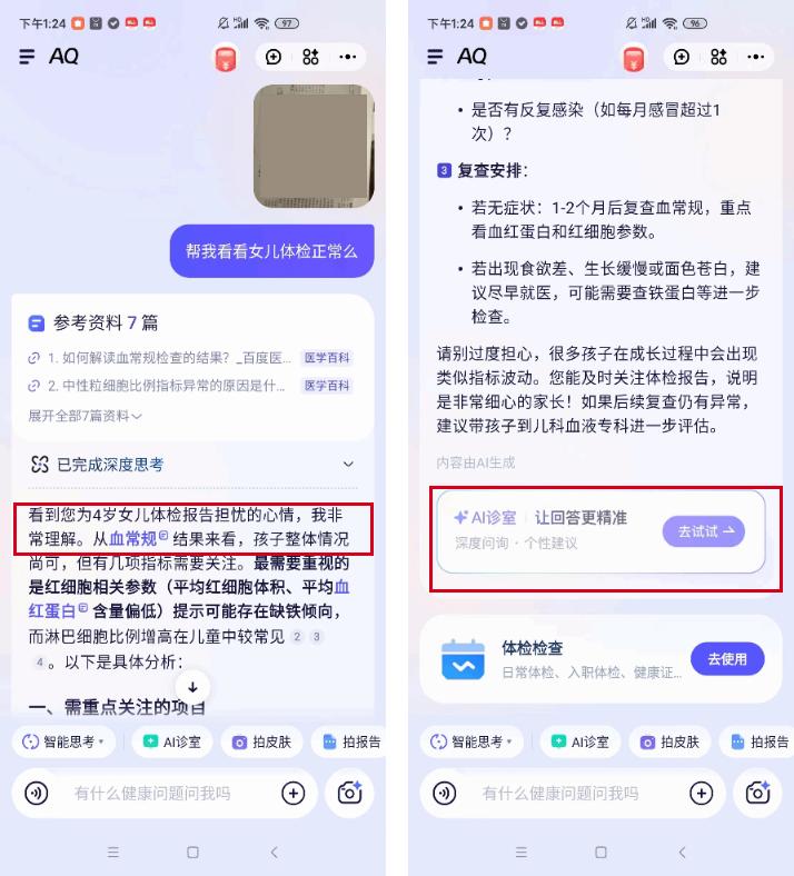 我用同一张儿童血常规报告测试了小荷和蚂蚁的 AQ。AQ 要求我先回答一系列问题才能开始分析,而小荷则直接从图片入手,迅速给出结论。