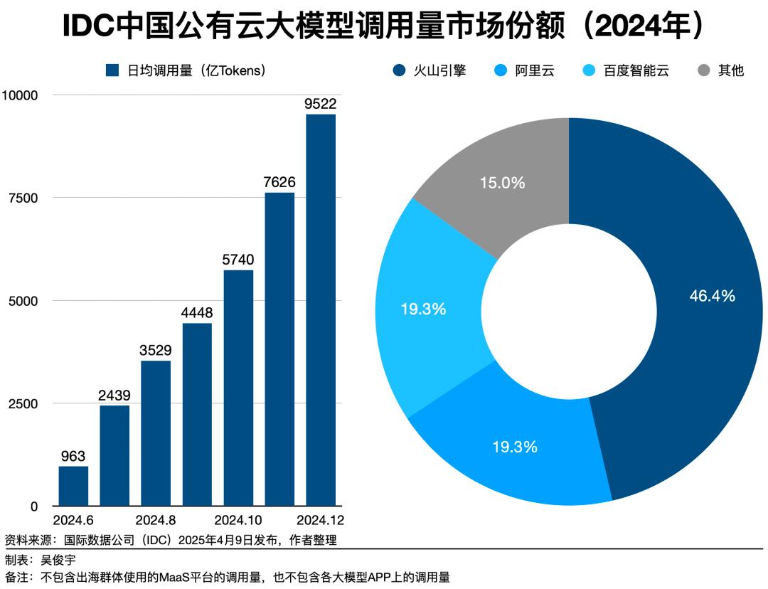 值得注意的是,火山引擎作为字节跳动的云服务品牌,直到 2020 年才开始向外界提供服务——在成立仅五年的情况下,就在大模型公有云领域实现了对传统巨头的赶超。根据 IDC 的数据,自 2024 年下半年起,中国云上的大模型调用量将迎来爆发式增长,日均调用量从 6 月的 963 亿次激增至 12 月的 9522 亿次,半年内增长近十倍。推动这一飞跃的正是厂商能力的提升与价格门槛的降低。而字节的豆包大模型无疑是降价潮的先行者:早在 2024 年 5 月,豆包 1.0 便率先发起了价格攻势,每千 Tokens 的费用比行业平均低 99.3%;同年 12 月,其视觉模型的定价更是做到 1 元处理 284 张图片,较同行低了 85%。正如《21 世纪经济报道》所评价的:“大幅降低模型推理成本,将多模态大模型迅速应用于行业,同时把价格打下来,这是火山引擎一贯的经营策略。”