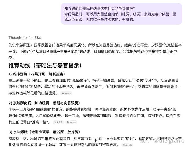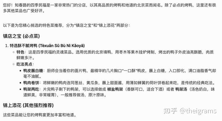 它从大众点评中检索了相关评价,呈现出条理分明的回答,仿佛是一份简洁的攻略。