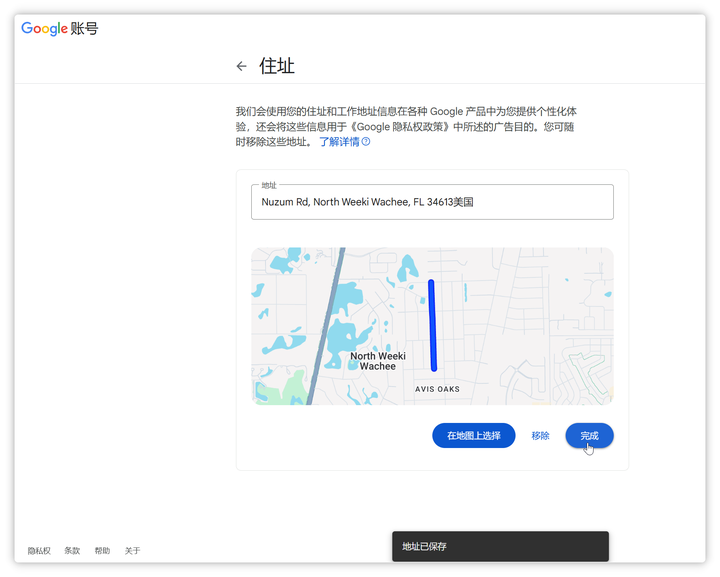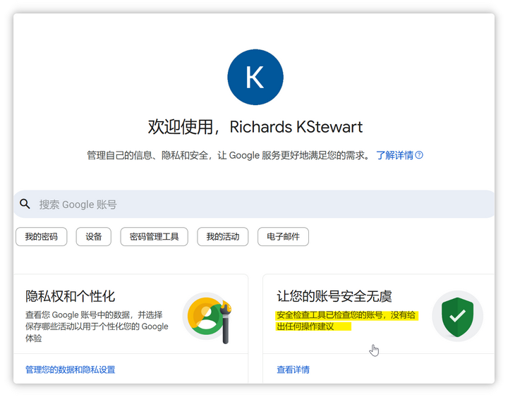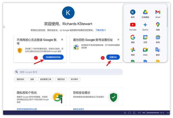 我们注意到谷歌的两个安全提示,一个是添加辅助电话号码,一个是设置地址。