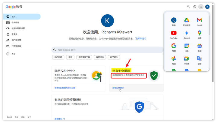 注意到下图中的【您有安全提示】吗?系统经过安全检查后给出的提示,我们点击进去进行检查,进一步解除系统的风控。