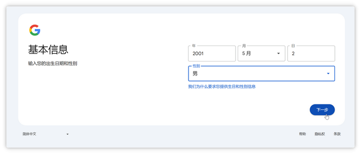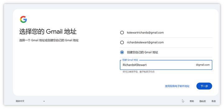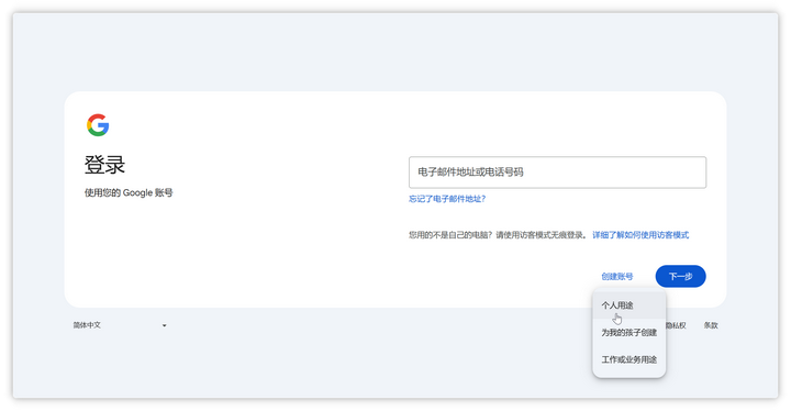 打开谷歌账号创建页面。有人说必须使用美国地区的 IP,其实这并不是必要的,我用的是日本的 IP,同样有效。只要 IP 干净,就不会有问题。请看下面的操作。