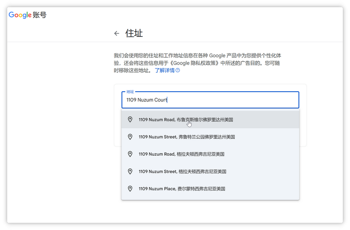 第二个是填写地址,我们可以在 Google 上搜索美国人的身份地址,随便填写一个即可。