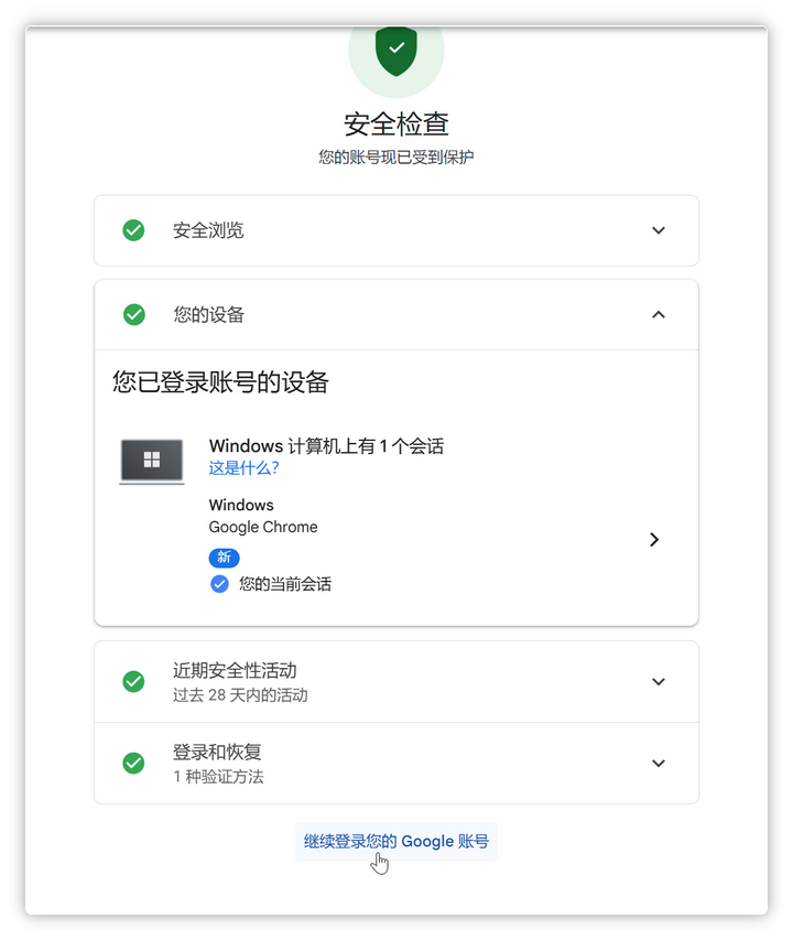系统提示安全检查工具已检查您的账户,没有任何操作建议,说明您的账户安全性相当高。