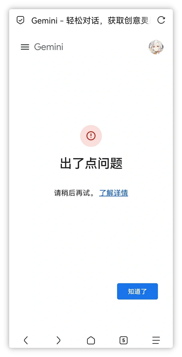 经过这些天的努力,我终于找到了成功注册 Gemini 的方法。以下是我能够成功打开 Gemini 页面的经历,再也没有出现【出了点问题,稍后再试】的提示了!