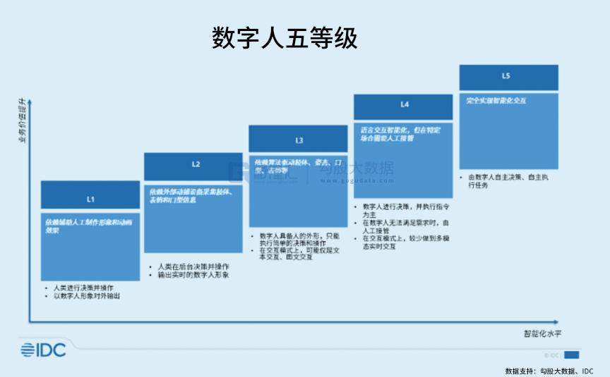 根据 IDC 的《中国 AI 数字人市场现状与机会分析》报告,数字人被划分为五个等级,目前其发展经历了从手工制作到 AI 建模的阶段,初具人的外形,但仍只能进行简单的交互决策。