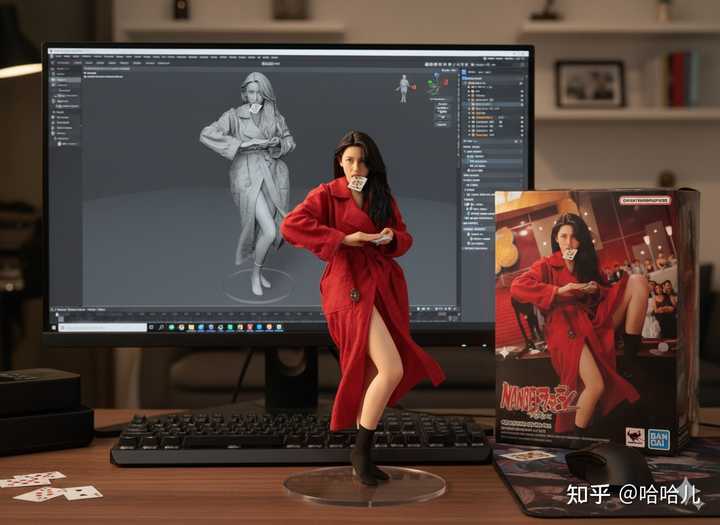 运用 Nano Banana 模型,我基于插画中的角色,打造了一个 1 / 7 比例的商业手办,风格为真实写实,环境也尽量贴近现实,力求细节和动作的最大化呈现。手办被置于电脑桌上,采用无文字的圆形透明亚克力底座。电脑屏幕上展示了 ZBrush 的建模过程,旁边则是一个万代风格的玩具盒,印有原插图。