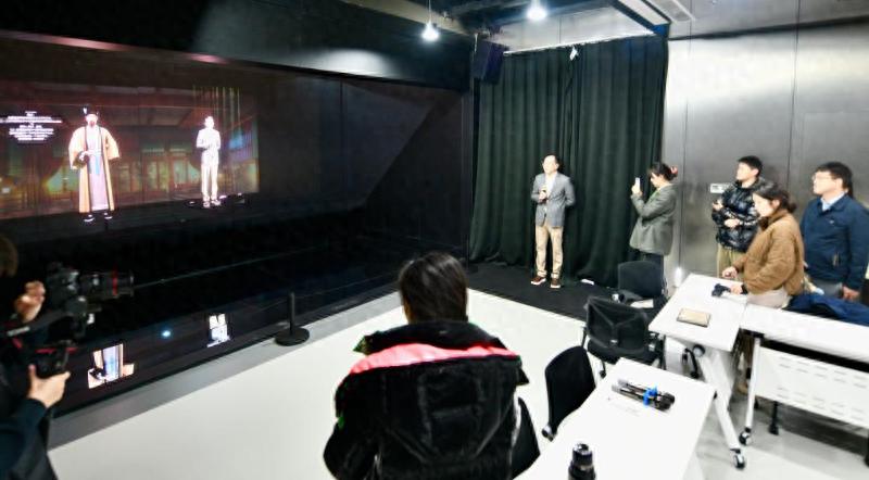 图为北京市数字人基地展厅内,数字人“苏轼”正在与观众对诗。(新华社发)