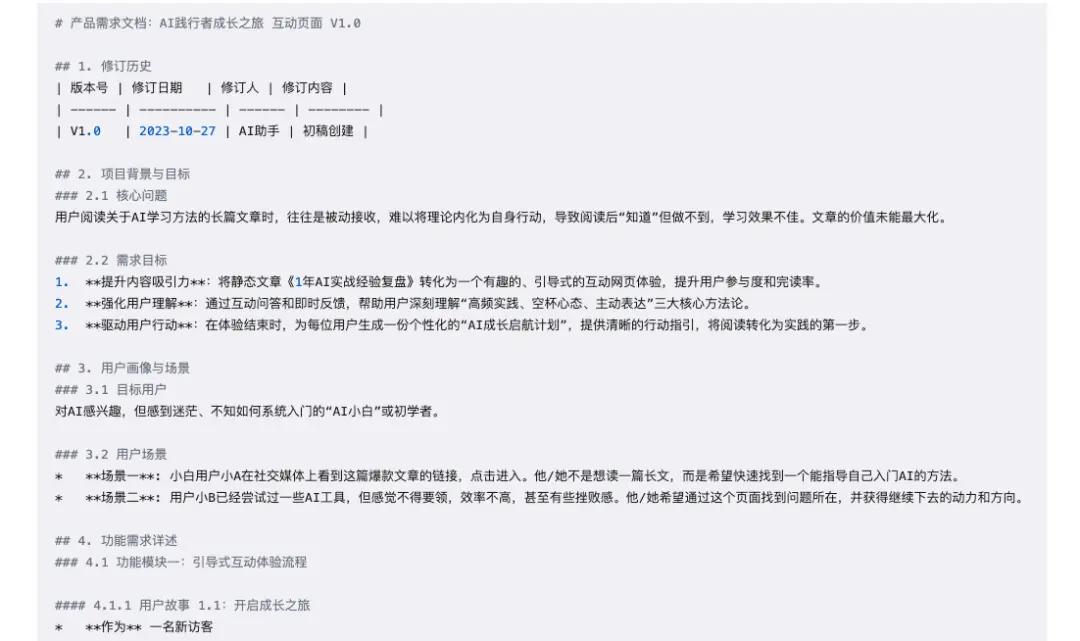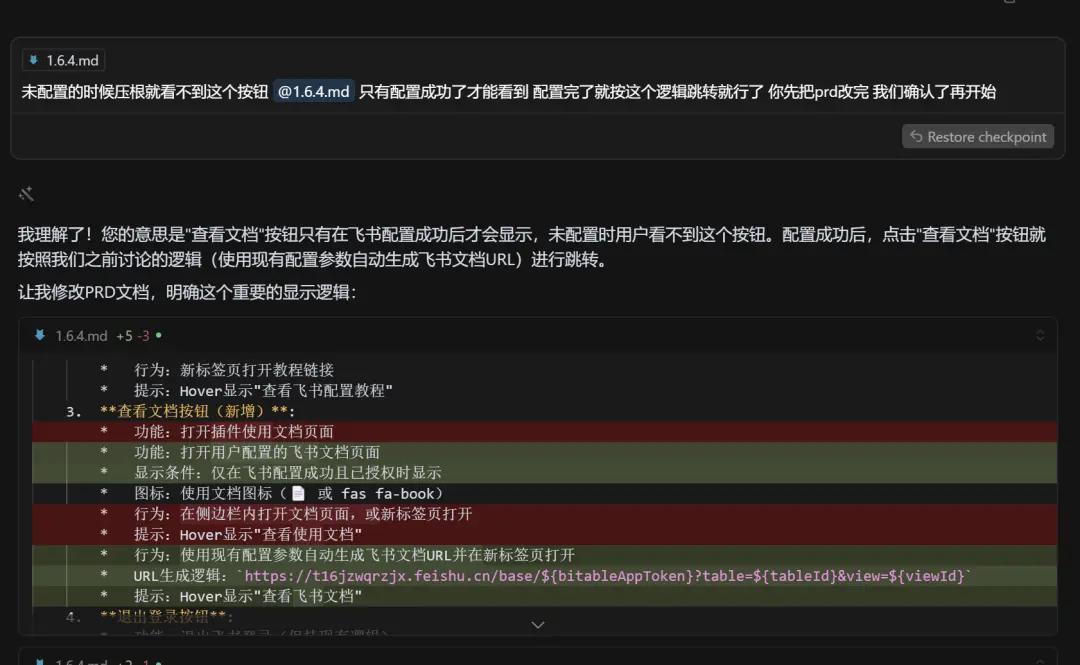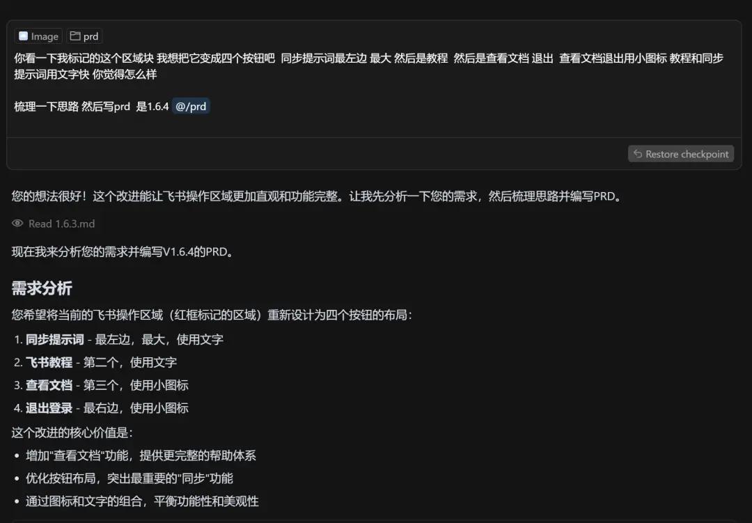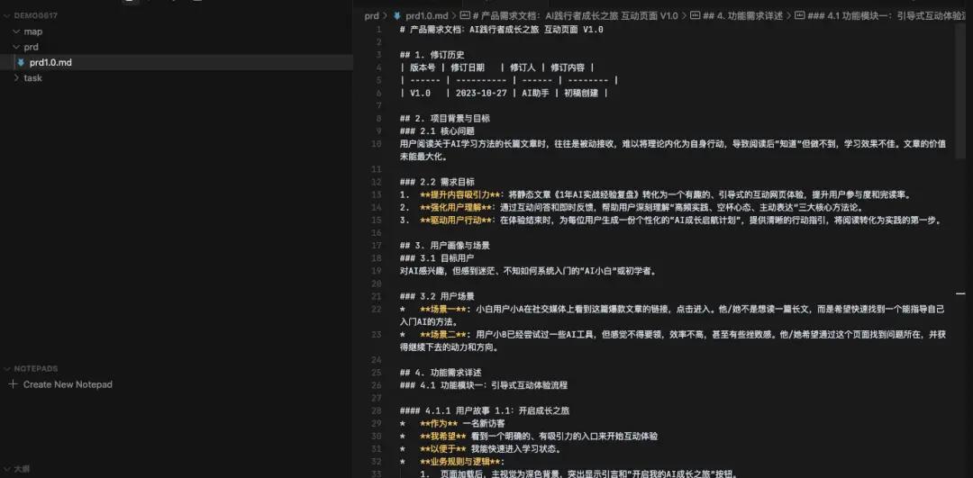 这块一方面是为了做好版本留档,当我们开发产品迭代数十个版本之后,在去找一些交叉的逻辑时候会十分方便,因为只需要让AI查阅prd就可以了。