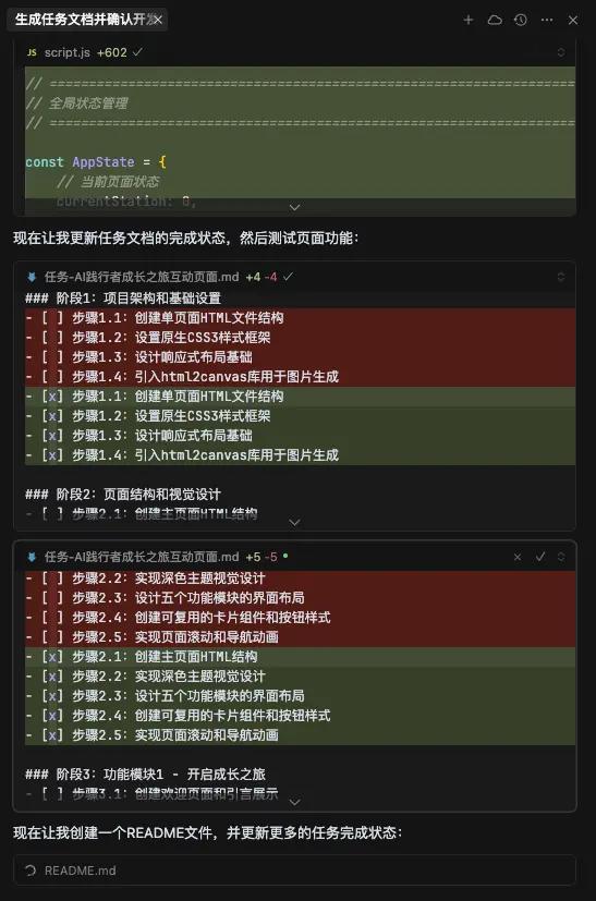确认无需调整后,让cursor按照任务规划文档进行开发就好了,这样的好处是AI每一次开发的内容都足够清晰,也方便我们溯源每次的问题在哪里。