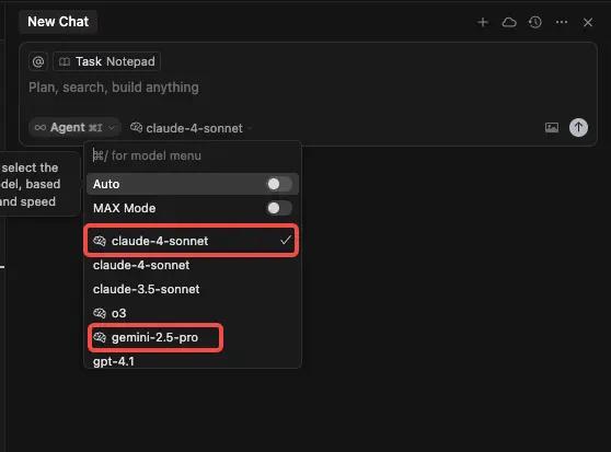当上边的内容配置好后,我们将让AI基于prd来进行开发,在给AI指令前,我们调整一下自己要选择的模型,新手的话默认claude-4-sonnet就行了,老手可以根据自己的开发习惯进行配置。