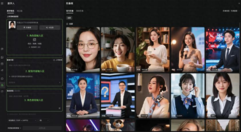 此外,为了实现更为便捷的“即用”体验,可灵 AI 还提供了一站式解决方案。用户不仅可以上传自己的素材,还可使用内置的官方形象库、AI 生图功能以及近百种 TTS 音色,轻松完成角色创建和配音的全过程。