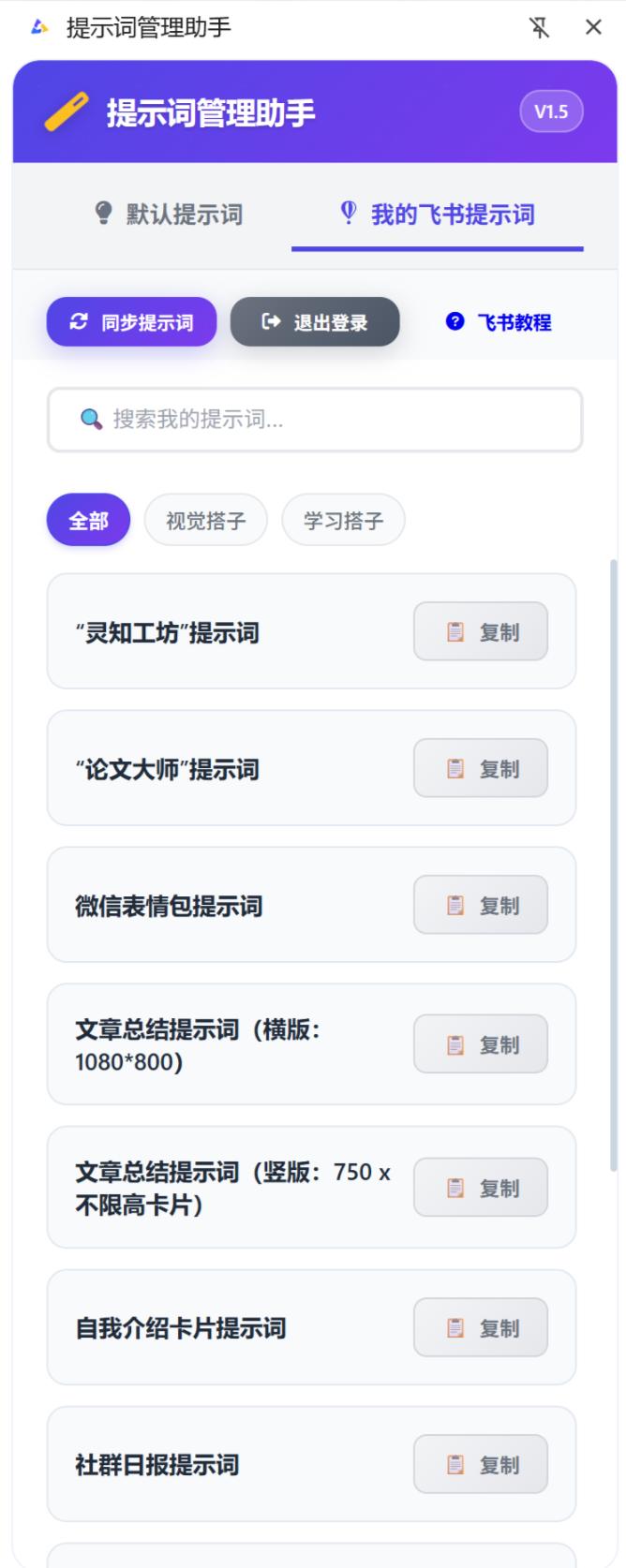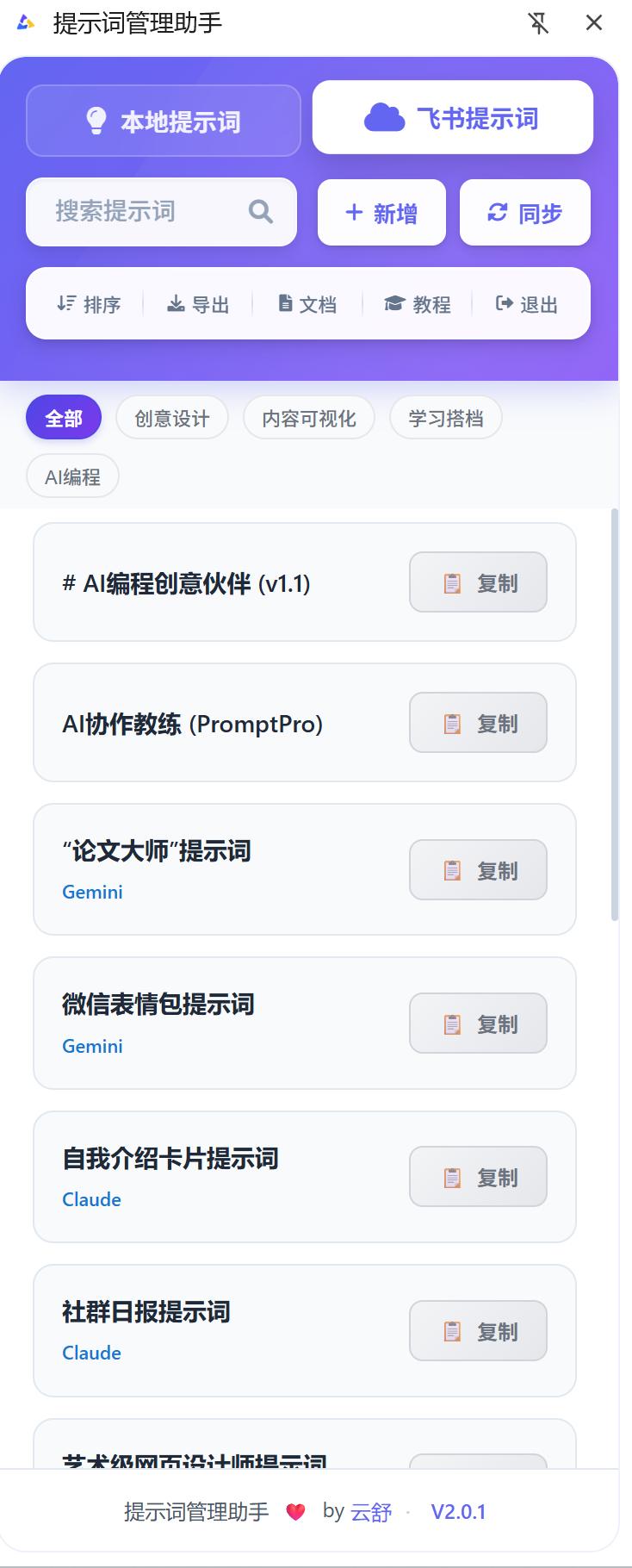 从需求到落地:提示词管理助手的开发历程当我首次着手进行项目时,最初并没有计划将其发展为一款产品。我只是简单整理了飞书文档,创建了一个提示词的合集,这样一来,查找信息的效率有了显著提升。