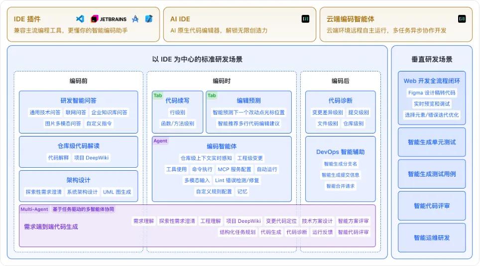 全流程覆盖:赋能开发全阶段场景。从编码前期的智能问答与架构设计,到编码过程中的代码续写与生成,直至编码后的代码诊断,实现了开发全流程的覆盖。