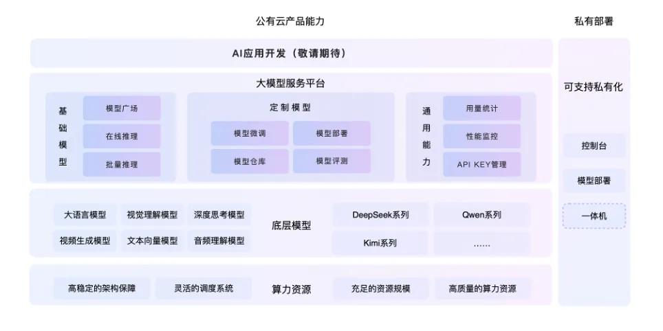 该平台基于高稳定性的架构和优质的算力资源,通过自研及第三方模型不断丰富基础模型生态,进而搭建出一个高可用、安全易用的大模型服务开发平台。兼容私有化部署,满足企业用户在各种业务场景下的需求。