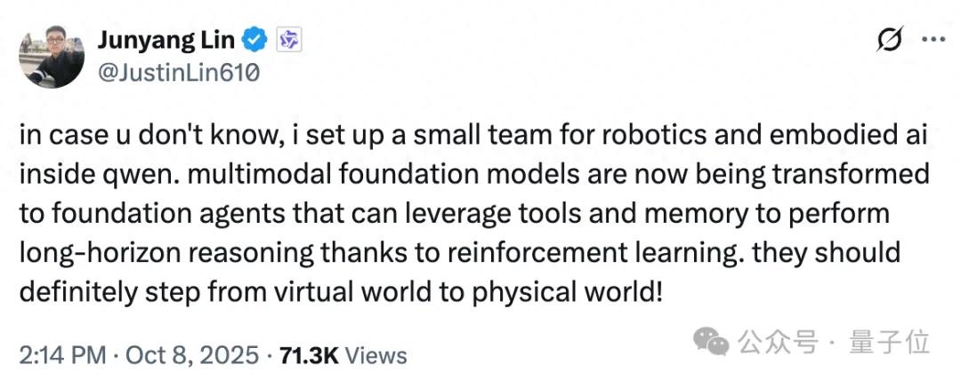 在关于具身智能小组的公告中,林俊旸提到: