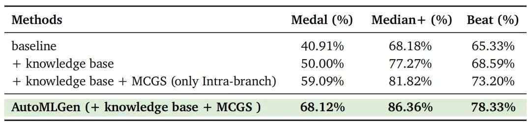 AutoMLGen在MLE-Bench上刷新了自动机器学习智能体的纪录。仅用 12 小时预算(标准时长的一半),便实现36.4%平均奖牌率与18.7% 金牌率,在同类系统中表现最优,展现出在有限算力下的强大竞争力。