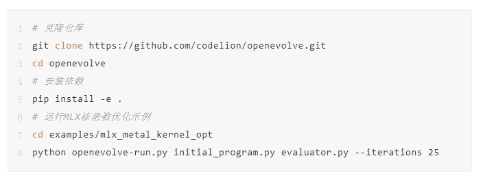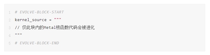 - 智能代码标记:通过特定标记,确保进化过程仅针对Metal核函数源代码,同时完整保留与MLX框架的集成代码。