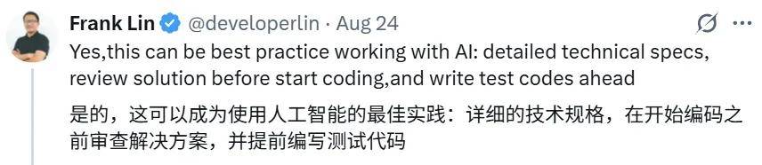例如,开发者Frank Lin提出,采用AI的过程中,可以将详细的技术规范视为最佳实践,建议在编写代码之前先对解决方案进行审查,并优先编写测试代码。