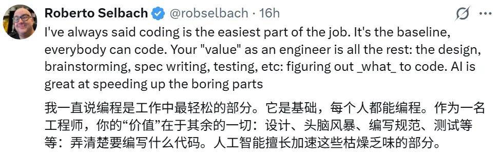 在这个过程中,编程被认为是最简单且乏味的环节,工程师的真正价值在于「设计、头脑风暴、编写规范、测试等」的能力,关键在于明确所需编写的代码。