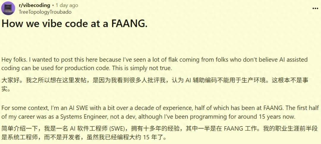 该帖子在 r/vibecoding 版块发布,发帖者 u/TreeTopologyTroubado 自述为一名拥有十余年经验的人工智能软件工程师,且其一半的职业生涯是在 FAANG(即 Meta、亚马逊、苹果、Netflix 和 Alphabet 五大科技巨头)中度过的。尽管他职业生涯的前半段是担任系统工程师,而非开发人员,但他现已积累了大约 15 年的编程经验。