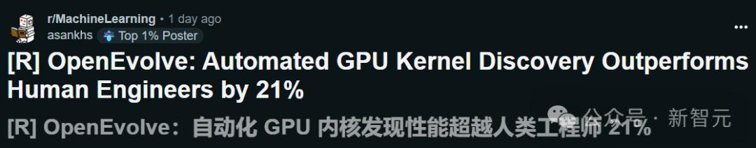 【新智元导读】近日,AlphaEvolve再创佳绩!依托其开源实现OpenEvolve,这一系统凭借自我学习与代码编写,迅速在苹果芯片上演进出比人类快21%的GPU核函数!此时此刻,自动化编程史上迎来了真正的里程碑,「AI为AI编程」的新时代已经开启,自动化奇点似乎触手可及。