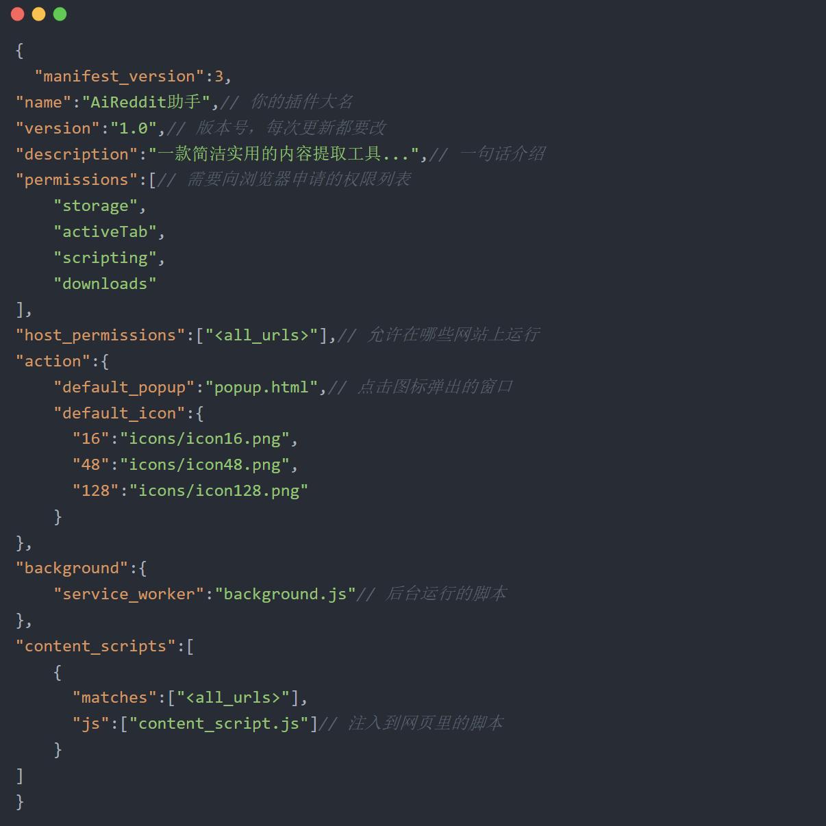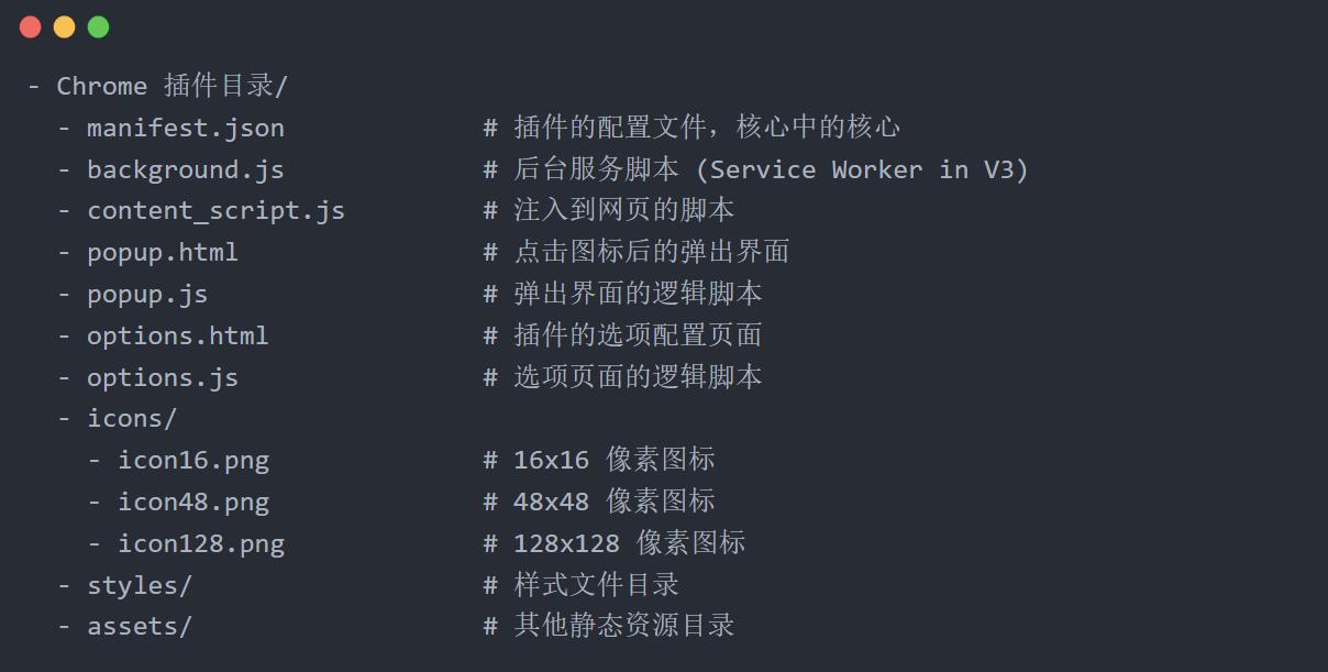 说白了就是一堆HTML、CSS、JS文件,但核心是manifest.json配置文件。这玩意儿就是插件的“身份证”,是整个插件的入口和配置文件。它以 JSON 格式声明了插件的名称、版本、描述、所需权限、图标及各个功能模块的入口文件。必须遵循 Chrome 的规范,当前主流版本为 Manifest V3。