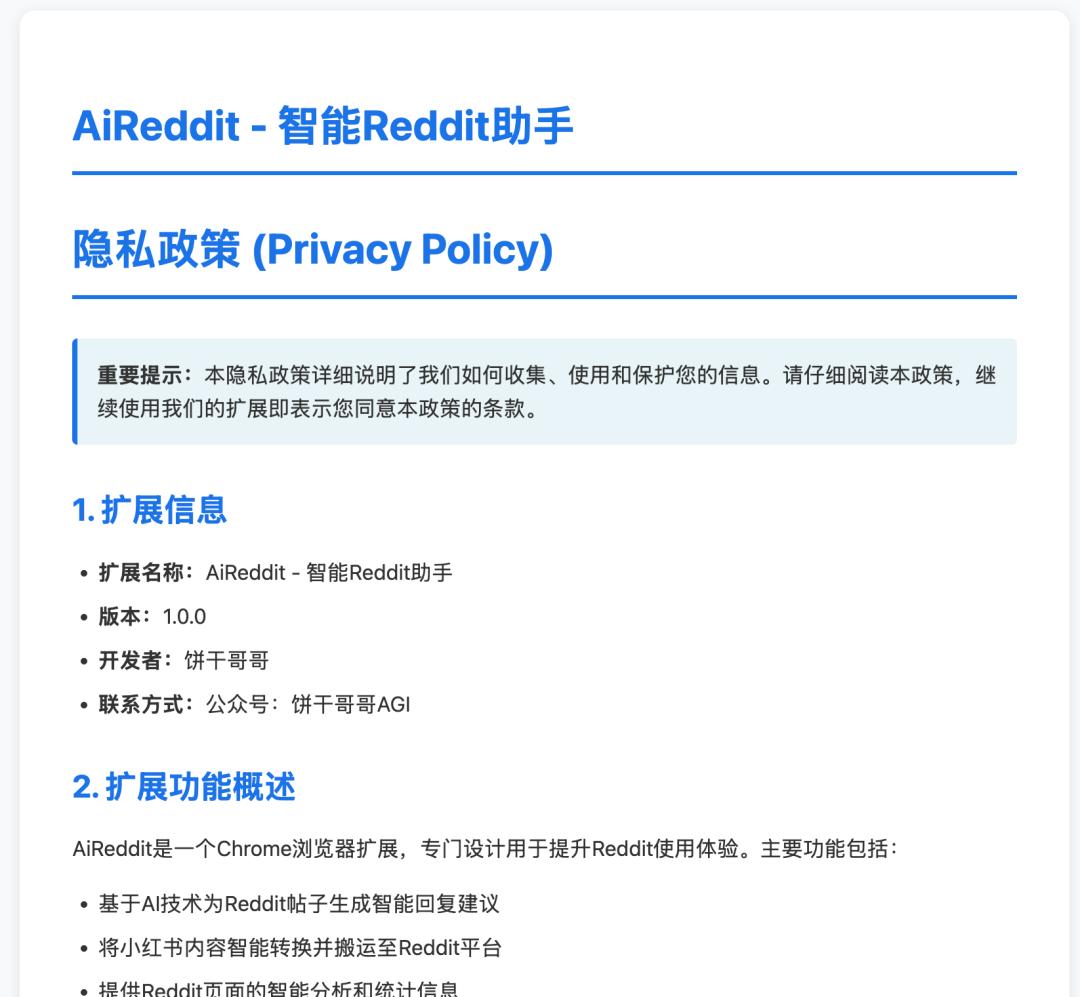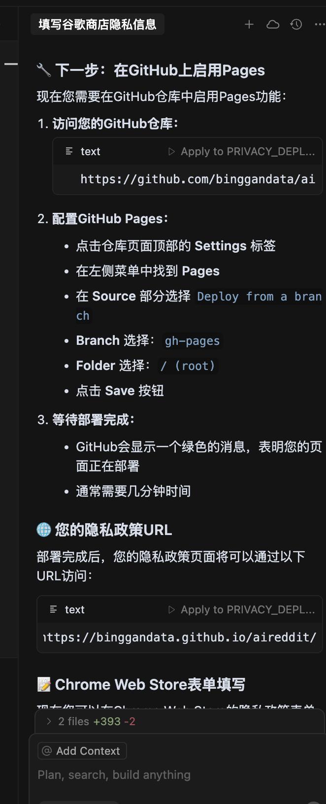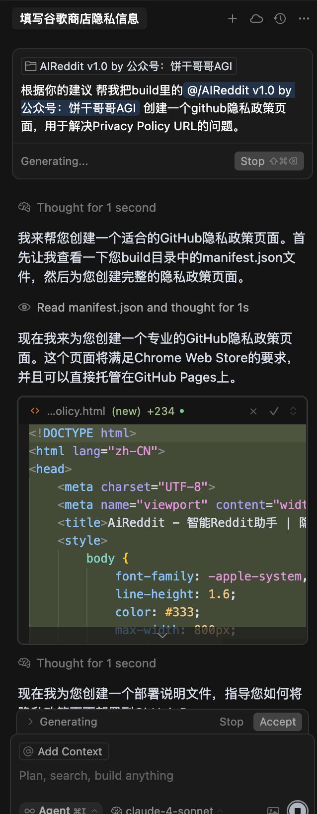 这里,我们让Cursor帮我们生成内容后部署到Github Pages上。帮我把build里的@/AIReddit v1.0 by 公众号:饼干哥哥AGI 创建一个github隐私政策页面,用于解决Privacy Policy URL的问题。
