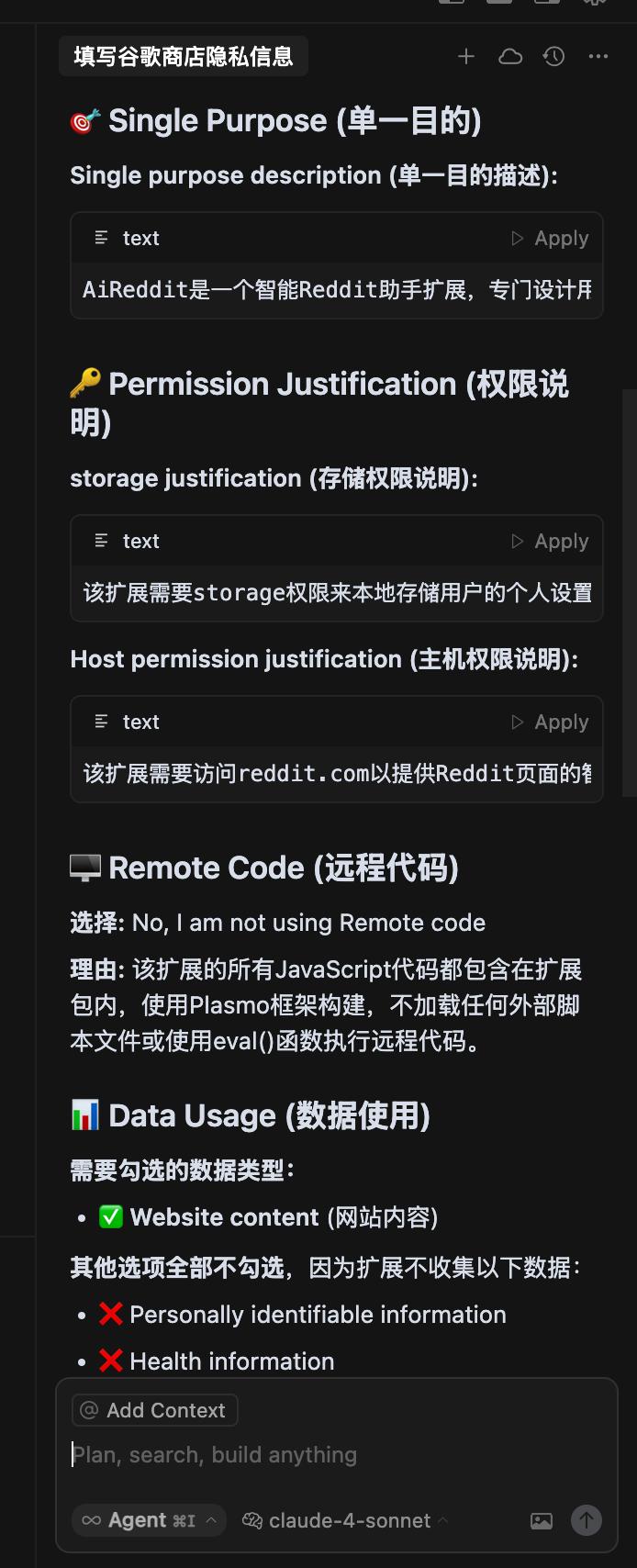 本文为AI编程爱好者提供了一份从零开始开发浏览器插件并成功上架谷歌商城的详细指南。作者以开发一款Reddit营销助手为例,详细拆解了开发、调试、注册、支付、打包、上传、填写信息、隐私审核等关键环节,帮助读者将创意转化为实际产品,并实现商业化落地。