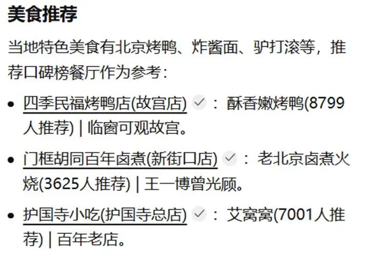 在餐饮推荐方面,携程AI为用户推荐了三家具有北京地方特色的美食餐厅:
